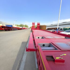 Low flatbed semi-trailers have flatbed, concave beam and tire exposed structures, and the longitudinal beams are straight or gooseneck. The frame is stepped, and the cross section of the longitudinal beam is I-shaped, which has the characteristics of high rigidity and high strength.